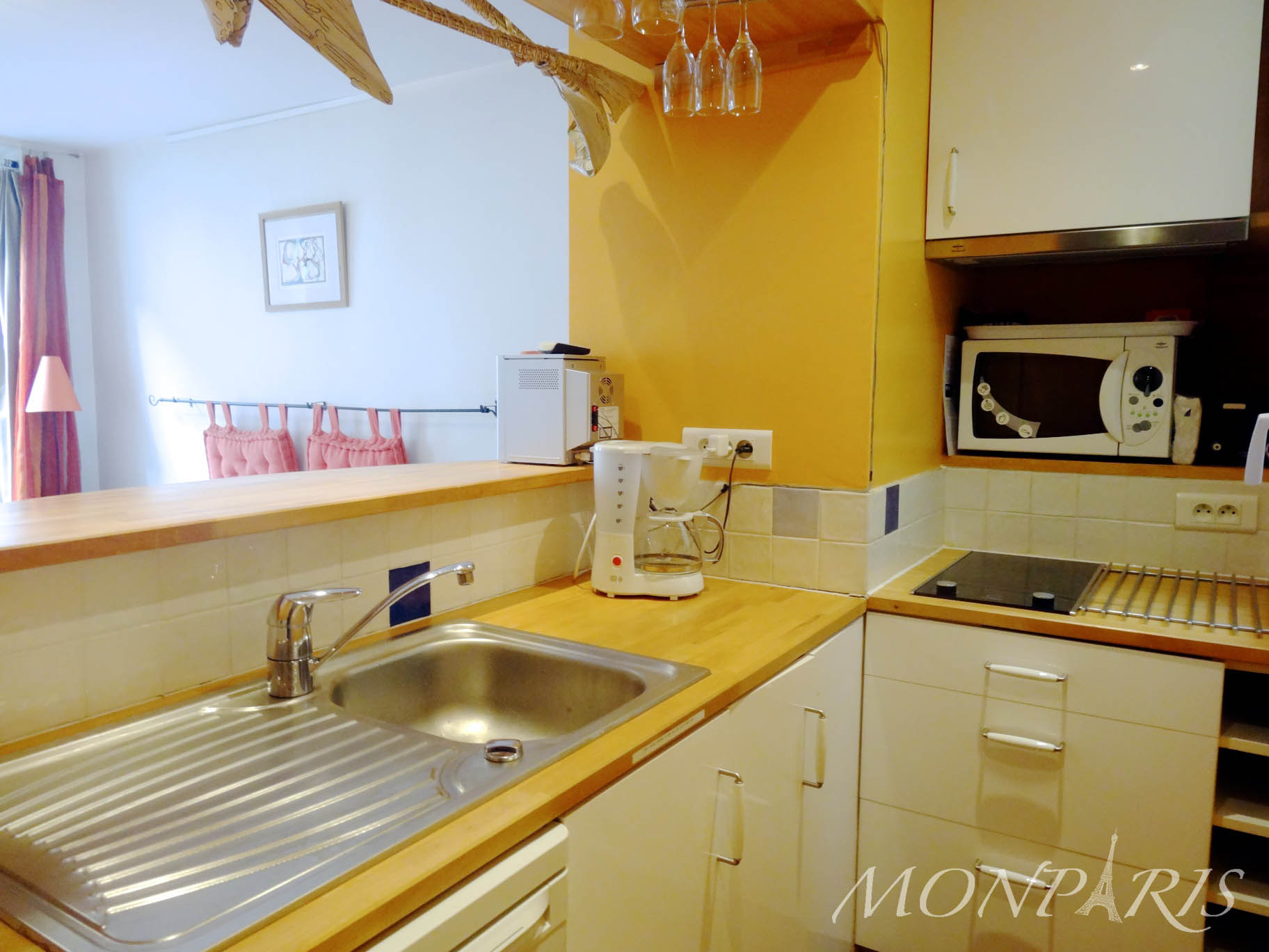 - Cozinha americana e bem equipada: geladeira/freezer, chaleira, cafeteira, torradeira, fogão vitrocerâmica de 2 bocas, microondas, maquina de lavar.